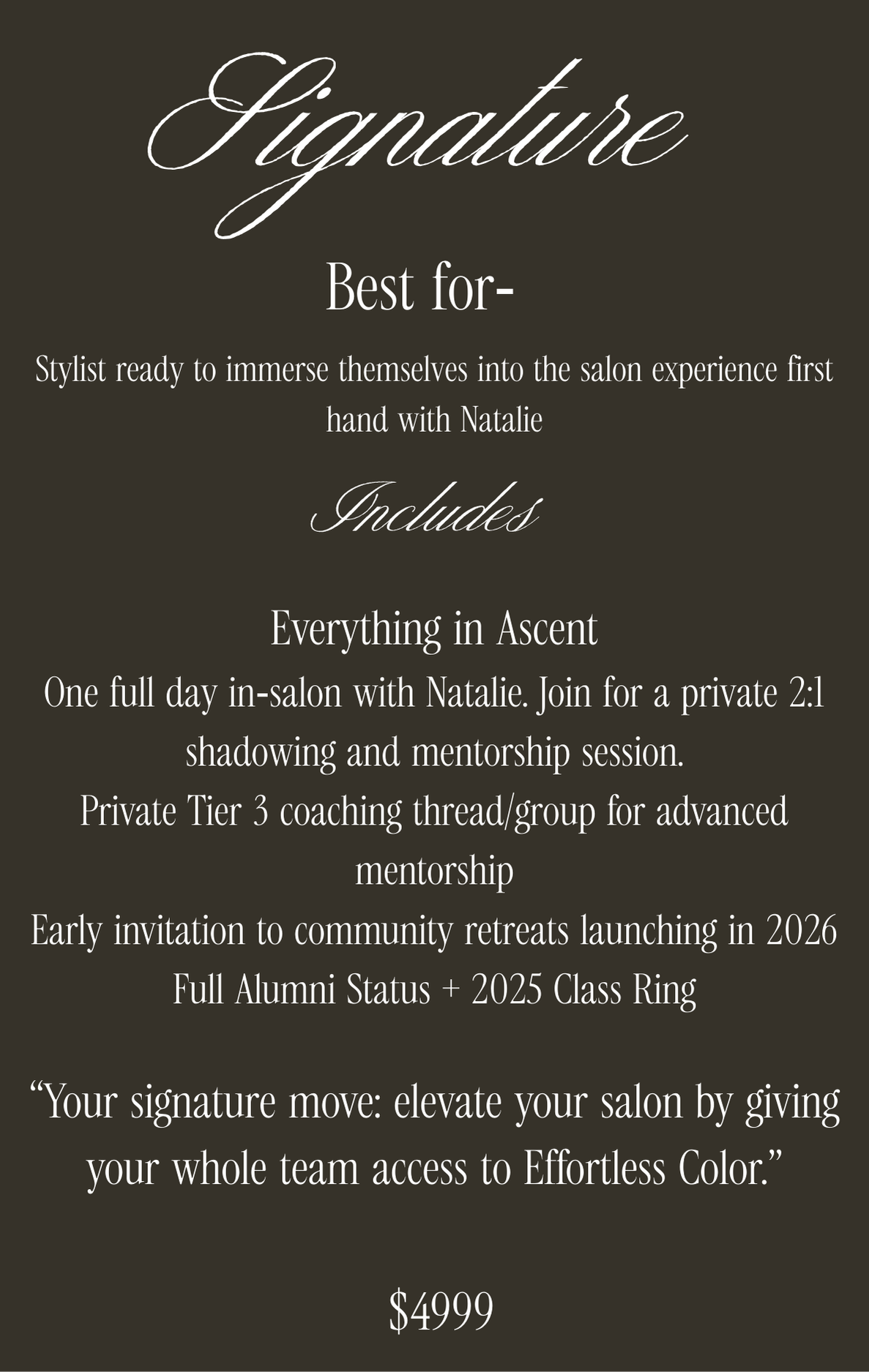 You’ll learn the exact placements, formulas, and finishing techniques Natalie uses daily behind the chair, while also gaining long-term access to future education, alumni perks, and mentorship options at every level.